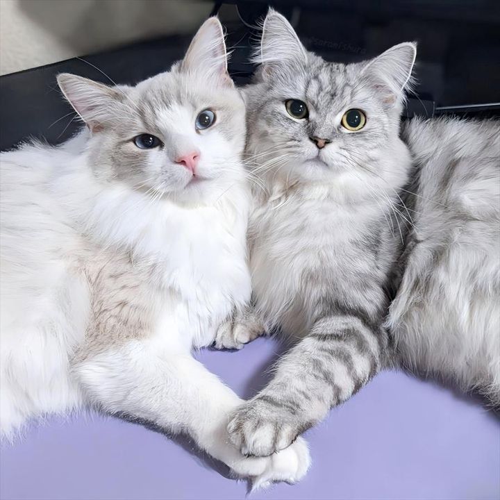 左側にいるのがラグドールの『りおら』くんで、右側にいるのがノルウェージャンの『しゅら』くん。 顔を寄せ合って仲睦まじい様子ですが・・・・。