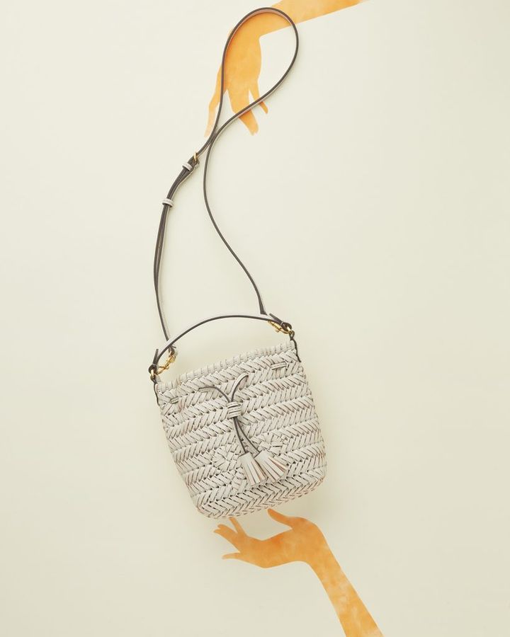 柔らかいレザーでブランドアイコンのリボンモチーフを編み込んだ巾着バッグ。秋冬のコーディネートにこそ、こんな柔らかな白で抜け感を与えて。バッグ「Micro Neeson Drawstring」〈H16×W21×D10〉¥69,000(アニヤ・ハインドマーチ/アニヤ・ハインドマーチ ジャパン)