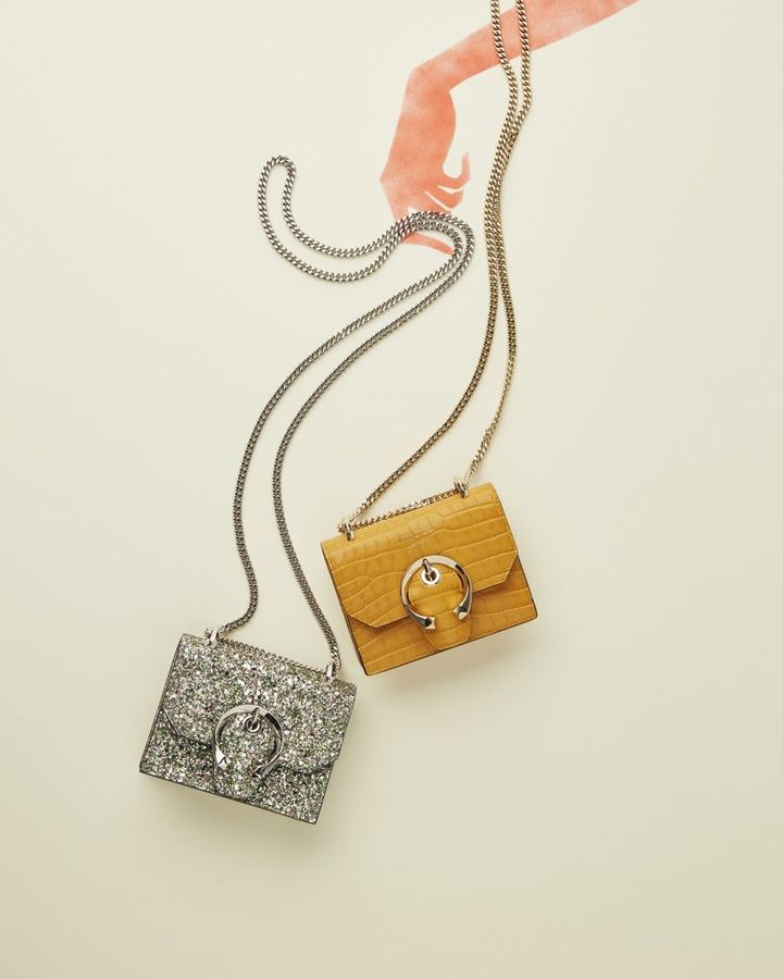 手のひらに乗るほどのキュートなサイズ。大人にふさわしい型押しと、JIMMY CHOOらしさ全開の華やかなグリッターに目が釘付け!バッグ「MINI PARIS」〈H9.5×W12×D6〉各¥70,000(ともにJIMMY CHOO)