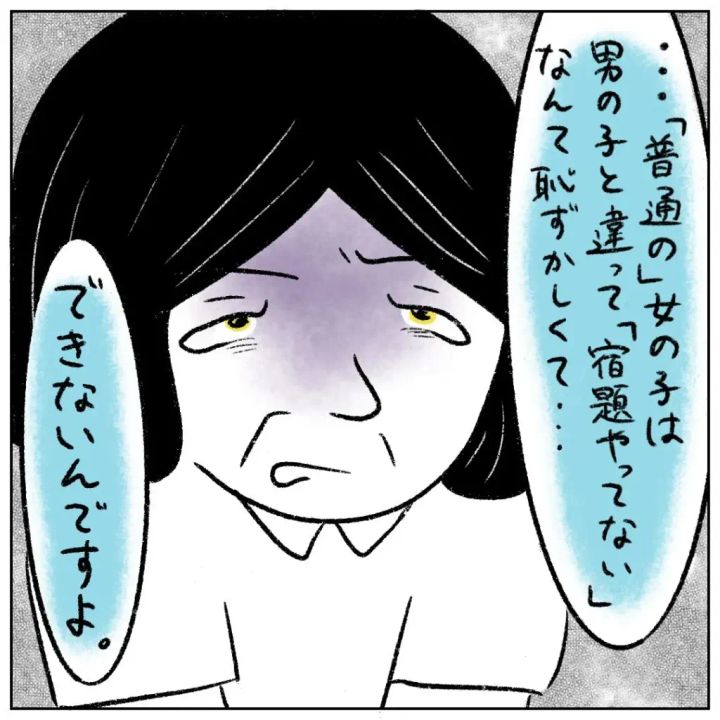 すると、「・・・『普通の』女の子は男の子と違って『宿題やってない』なんて恥ずかしくて・・・できないんですよ」と、またしても偏った考えを口にする先生。