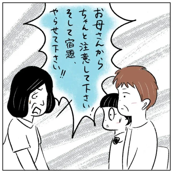 お母さんの意見には耳を傾けず、女の子なのだから宿題をちゃんとやるべきだという主張を散々繰り返した先生は、「お母さんからちゃんと注意して下さい!そして宿題やらせて下さい!!」と言いました。