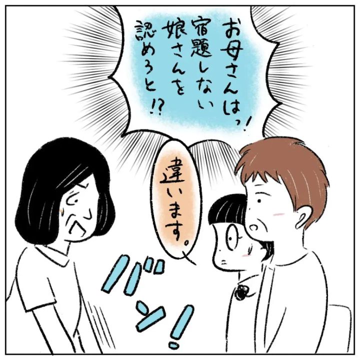 「お母さんはっ!宿題しない娘さんを認めろと!?」と机を叩きながら声を荒げる先生に「違います」と冷静に返すお母さん。