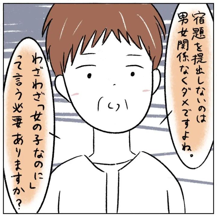 「宿題を提出しないのは男女関係なくダメですよね。わざわざ『女の子なのに』って言う必要ありますか?」と先生の『男の子はいいけど女の子はダメ』という考えに異議を唱えました。