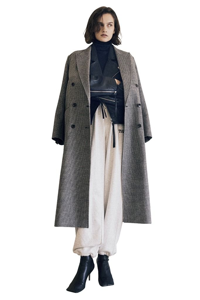 黒レザーライダースジャケット/メゾンスペシャル(メゾンスペシャル 青山店) 黒×白チェックロングコート/ジャーナル スタンダード レサージュ(ジャーナル スタンダード レサージュ 丸の内店) 中に着た黒タートルネック/グラフペーパー(グラフペーパー 東京)