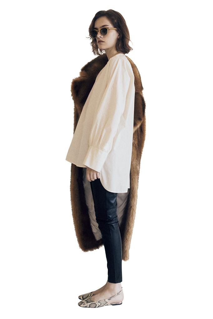 黒レザースキニーパンツ/ルームエイト(オットデザイン) ベージュブラウス/HER. 手に持ったロングファーコート/Jakke(ジャック・オブ・オール・トレーズ プレスルーム)