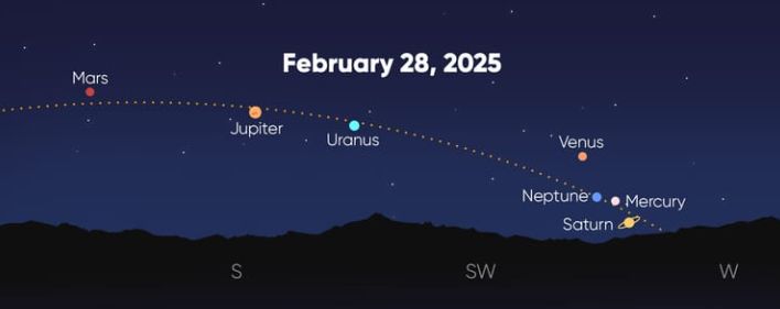 2025年2月28日、火星、木星、天王星、金星、海王星、水星、土星の7つの惑星が、夜空で一直線に並ぶ珍しい現象が起こります。