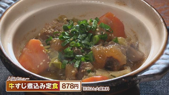 しょうゆと味噌でじっくり煮込んだ、プリプリでやわらかい“牛すじ”がご飯とよく合います。