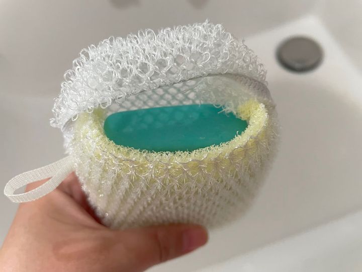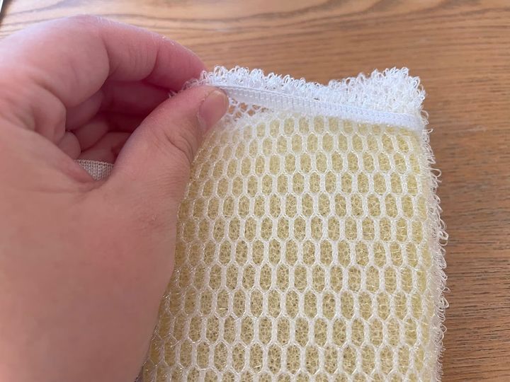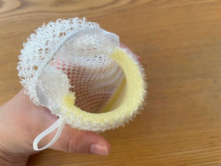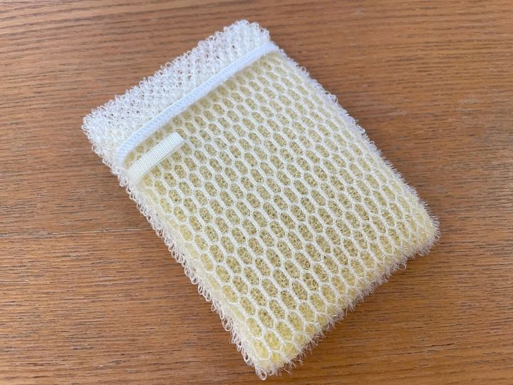 こちらのスポンジは袋状になっていて、中に市販の固形石けんを入れて使います。