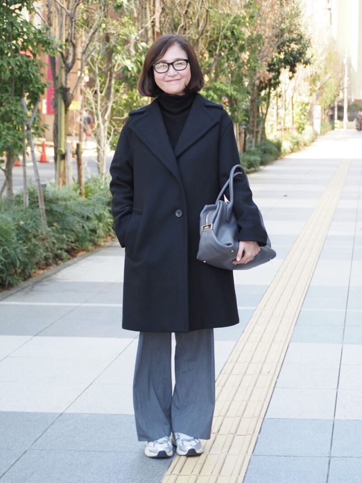 窪田さんのおしゃれのルールは、「3色以内でコーディネートを組むこと」。この日は「マッキントッシュ」のアウターと「ユニクロ」のスラックスで、落ち着いたツートーンコーディネートに仕上げています。「『ユニクロ』のタックパンツはインスタグラムで見かけて気になって購入したもの。ファッションの情報はSNSで得ることが多くなりました」。知的な雰囲気をかもしだす「ゾフ」の遠近両用メガネもポイント。