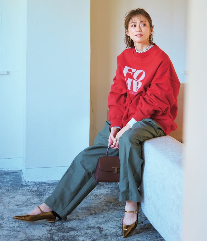 1枚でインパクトのある赤のロゴスウェットは甘さとキレイめ要素をプラスして大人な着こなしに。ラフなパンツ合わせもレースブラウスやメタリックパンプスでひねりを利かせれば上級者見えが叶います。