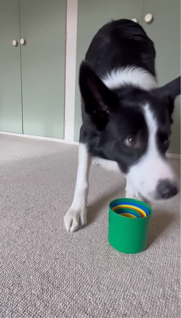 ボーダーコリーの『シンバ』の前にスタッキングカップを並べた飼い主さん。 このスタッキングカップは、異なるサイズのカップを積み重ねて遊ぶ子供向けのオモチャで、発展させた競技用の「スポーツスタッキング」というものもあります。