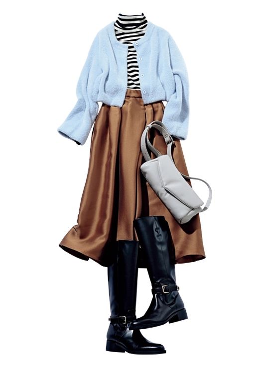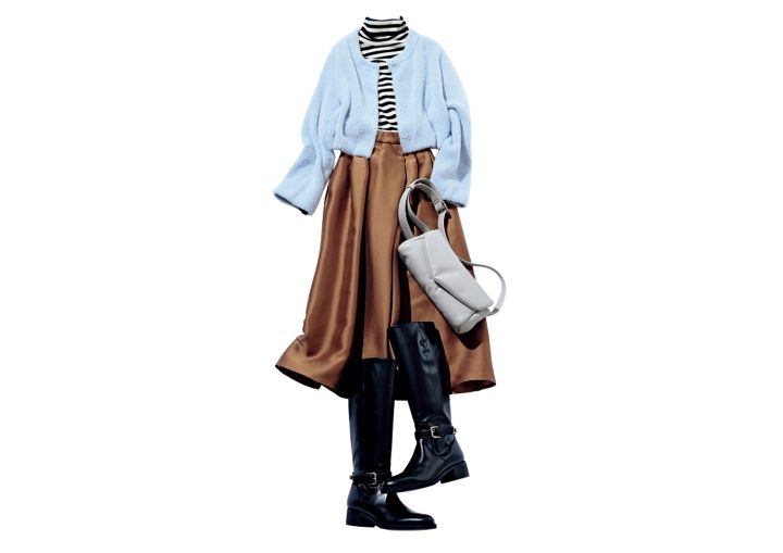 ニットセットアップ(カーデ)¥11,000/e/rm(アダストリア) ふんわりスカート¥25,300/ジャスグリッティー ボーダータートル¥4,389/ロペピクニック(ジュン) ロール型ショルダーバッグ¥8,800/カカトゥ(アンビリオン) ロングブーツ¥39,600/ダイアナ(ダイアナ 銀座本店)