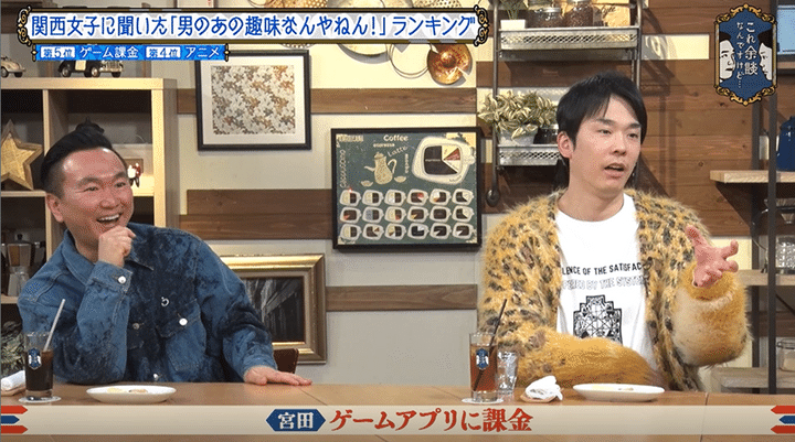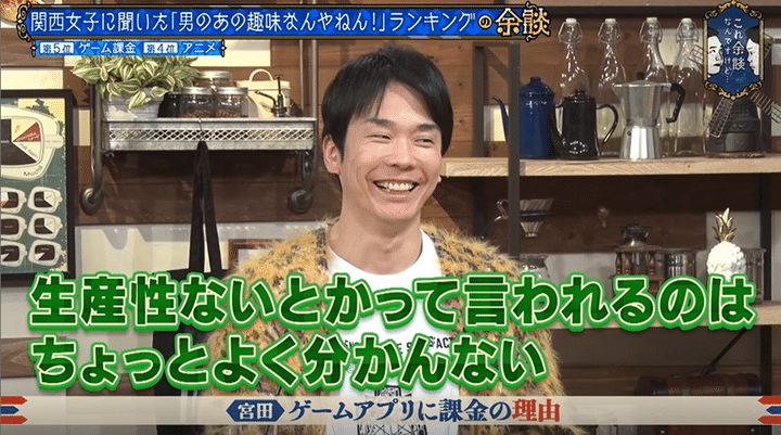 ゲームアプリへの課金について、宮田は「みんなごはんとか行ったりするじゃないですか。おいしいもん、焼肉行こうぜとか。2万とか3万するところに行ったと思えばいいじゃないですか」と持論を展開。「(自分にとってゲーム課金は)いいもん食べてるのと同じぐらいの感覚」なので、「生産性がないとか言われるのはちょっとよくわからない」とマジギレのテンションに。