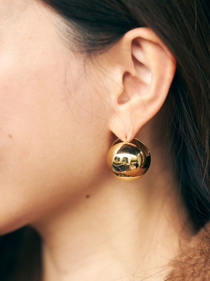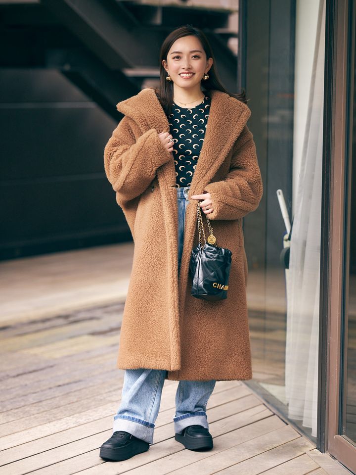 「冬はコーディネートにボリュームが出るので、アクセで盛るのが定番。耳元は大ぶりゴールドで、手元はシルバーのシェーヌダンクルを主役にしました。地金ミックスは一見難しそうですが、主役をひとつ決めてほかを華奢なアイテムにするとうまくいく気がします」田部郁実さん/フリーランスPR・158㎝(8歳の女の子と10歳の男の子ママ)
