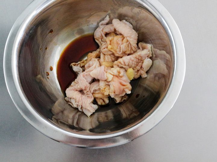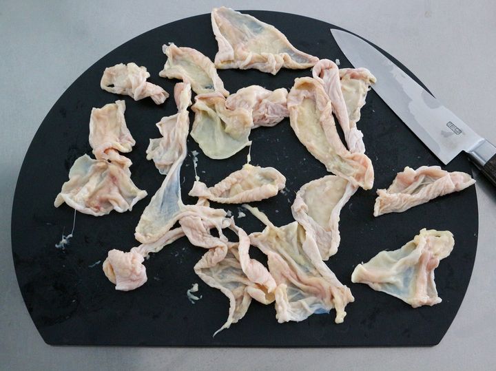 1. 鶏皮についている脂や身を取り除いて食べやすい大きさに切る。