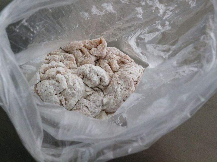3. キッチンペーパーなどで2の水分をしっかりと抑え、片栗粉とともにポリ袋に入れて振りながら片栗粉をまぶす。