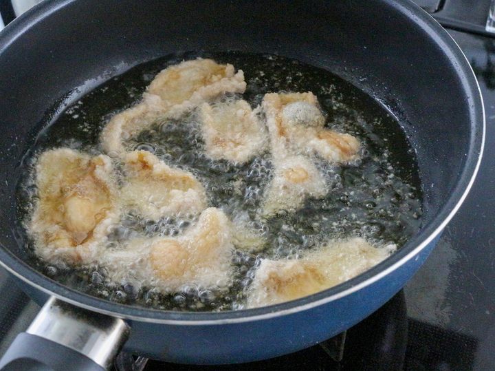 4. 170℃に熱した油に3を1枚ずつ広げながら入れ、5分程度揚げる。