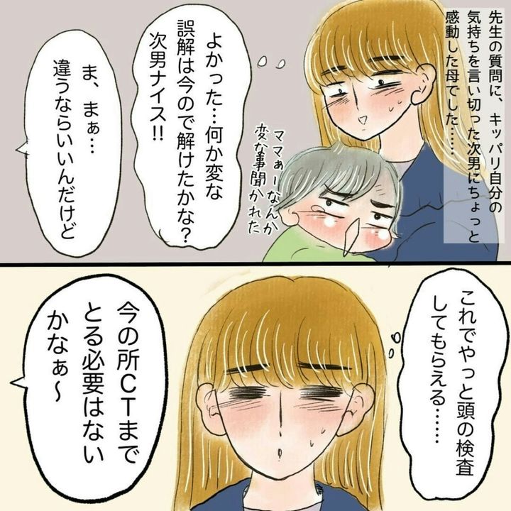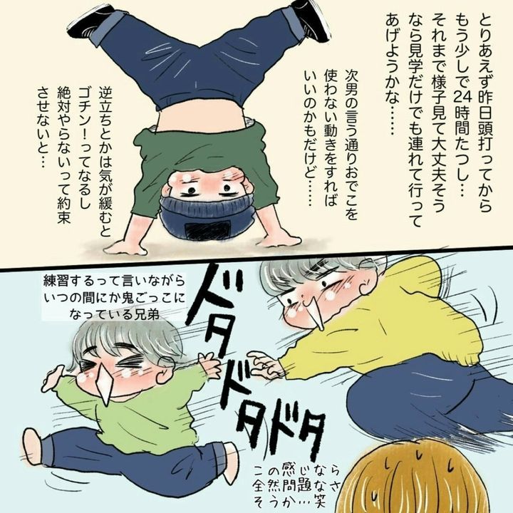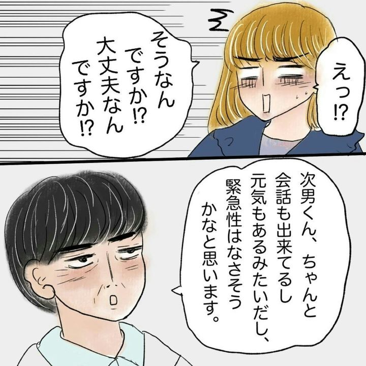 ところが、頭の中のことは診察ができないため、心配なら「脳神経外科への受診を」と告げられます。次男はたんこぶ以外は目立った外傷もなく、元気な様子…。とりあえずそのまま帰宅し、家で様子を見ることにしました。