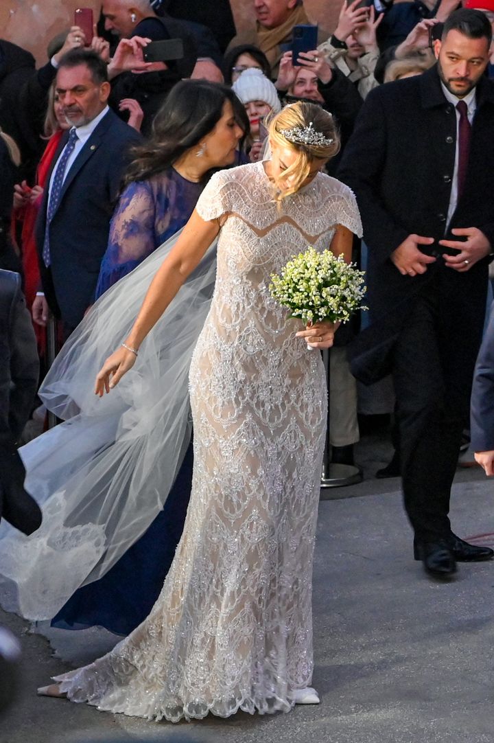 声明によるとクリストス・コスタレロスは、「クラシックとモダンの要素を組み合わせ、花嫁の個人的なスタイルに合わせました」「彼のデザインは、ギリシャの豊かな歴史への愛情と芸術を調和的に融合させ、繊細でロマンチックなディテールを加えたものです。その品質と質感ゆえに、シャンティイーレースが選ばれ、このドレスを作るのに使われた技術を際立たせました」とのこと。