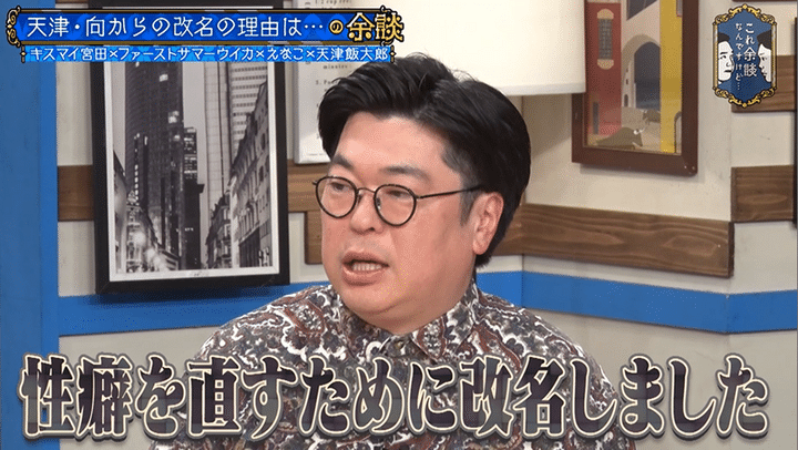 気になる改名理由について、飯大郎が「占い師の人に言われたんですよ。天津飯大郎にすれば、今まで曲がりに曲がってた性癖が元通りになりますって」と打ち明けると、スタジオは大爆笑!ファーストサマーウイカは「(性癖が曲がってたのは)名前のせいやったんですか!」と驚きの声をあげた。