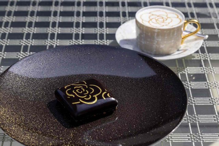 ボヌール ¥3,700「ベージュ アラン・デュカス 東京」のシグネチャーデザート「カレ・シャネル」とドリンクのセット。ゴールドのカメリアが描かれたスクエアのショコラムースの中に、ショコラビスキュイ、塩キャラメル、プラリネクリーム、ショコラガナッシュやカカオニブと蕎麦の実を使ったフィアンティーヌなどが層のように重なっており、食べ進めるごとに様々な食感や味わいを楽しめる人気の一品。