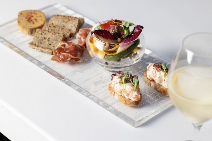 そのほか、「イベリコ豚の生ハム」や「サーモンのブリーニ風」といったフィンガーフード、「ベージュ アラン・デュカス 東京」の前菜をアレンジしたオードブルプレート、ココ・シャネルをイメージしたカクテルなども登場。銀座の街を見下ろす開放感あふれる空間で、心地よいひと時を過ごせます。