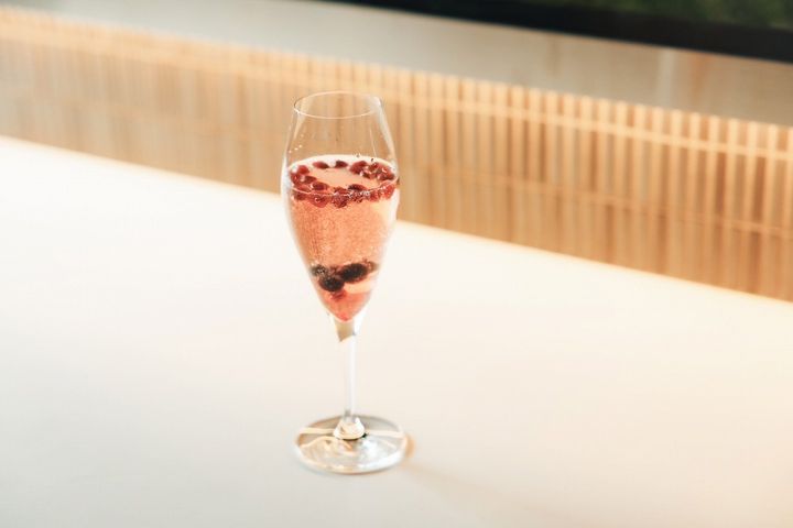 シャンパーニュカクテル「ココ」 ¥2,500ココ・シャネルをイメージし、シャンパーニュとエルダーフラワーを合わせた華やかな香りのカクテル。ブラックベリーとザクロを浮かべて煌めくジュエリーを表現しています。