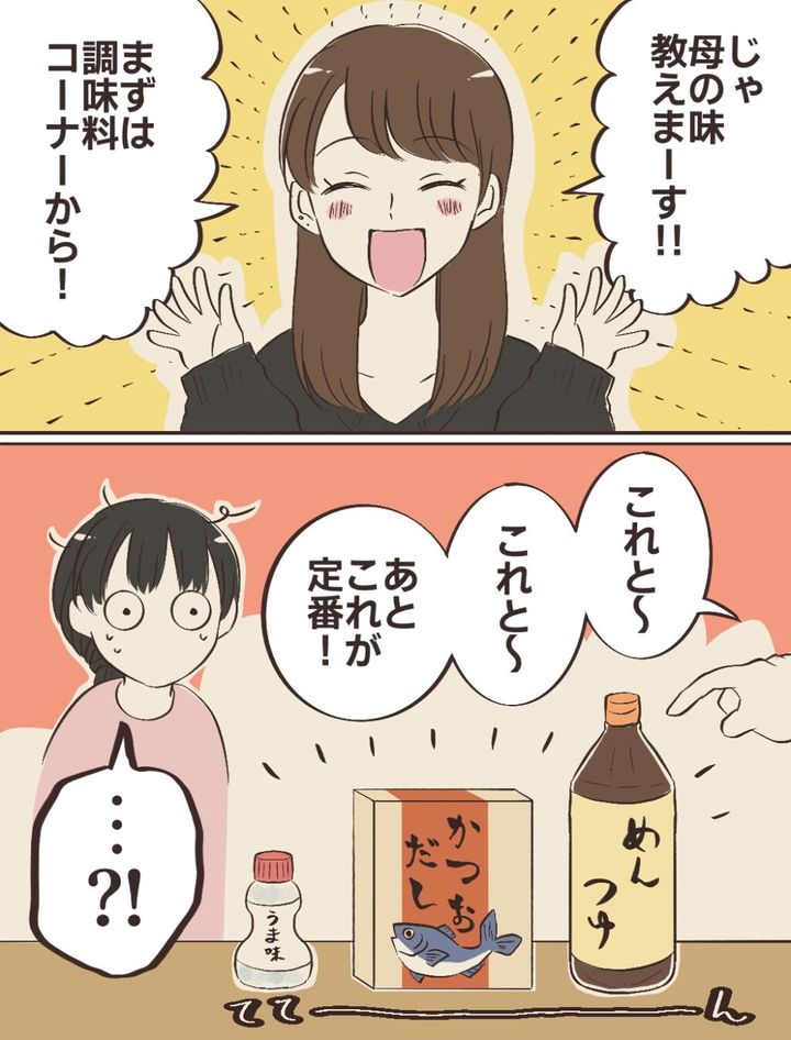 みのりさんが「じゃ、母の味教えまーす!!まずは調味料コーナーから!」と並べ始めたのは市販の出汁やめんつゆ、うま味調味料など今まで充さんにNGを出されていたものばかりでした。