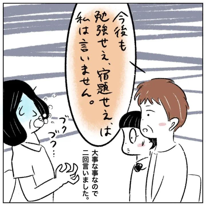 そして、「今後も勉強せぇ、宿題せぇ、は私は言いません」と、先ほどの言葉を繰り返したお母さん。お母さんの考えが理解できない先生は驚きすぎて何も言えません。