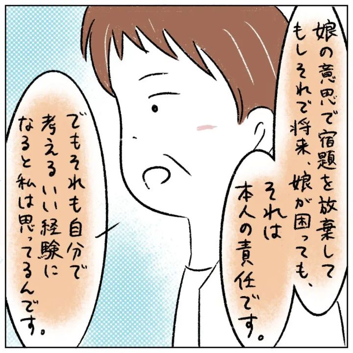 「娘の意思で宿題を放棄して、もしそれで将来娘が困っても、それは本人の責任です。でもそれも自分で考えるいい経験になると私は思ってるんです」と、宿題をするよう言わない理由を丁寧に説明したお母さん。