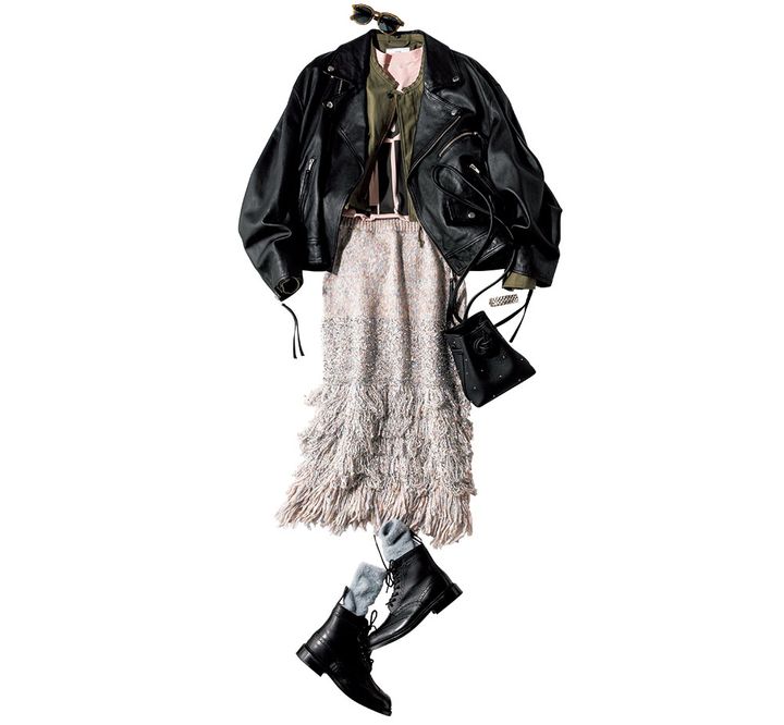 スカート¥22,000(ジユウバイラベルエチュード)ライダースジャケット¥41,800(メゾンスペシャル/メゾンスペシャル 青山店)ミリタリージャケット¥41,800(ハイク/ボウルズ)Tシャツ¥15,400(THIRD MAGAZINE×KATHARINE HAMNETT/THIRD MAGAZINE)バッグ¥47,300(ヴァジック/ヴァジックジャパン)ブーツ¥132,000(トリッカーズ/トリッカーズ 青山)ソックス¥1,200(バナナ・リパブリック)サングラス¥47,300(アイヴァン/アイヴァン 東京ギャラリー)ブレスレット※店舗限定¥30,800(フィリップ オーディベール/アンタイトル)