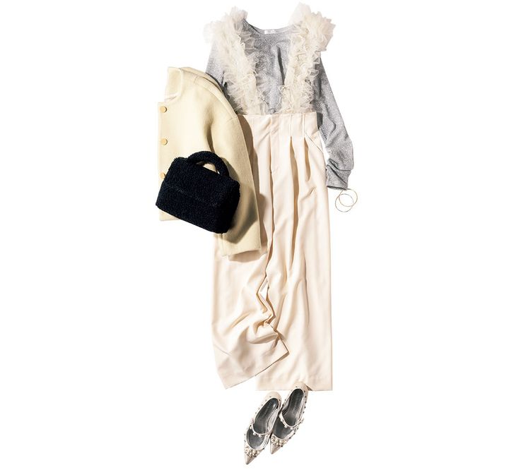 ざっくりニットやブーツで脱パーティ仕様に。チュールとラメを重ねた最上級の華やぎはカジュアルに落とし込んで。