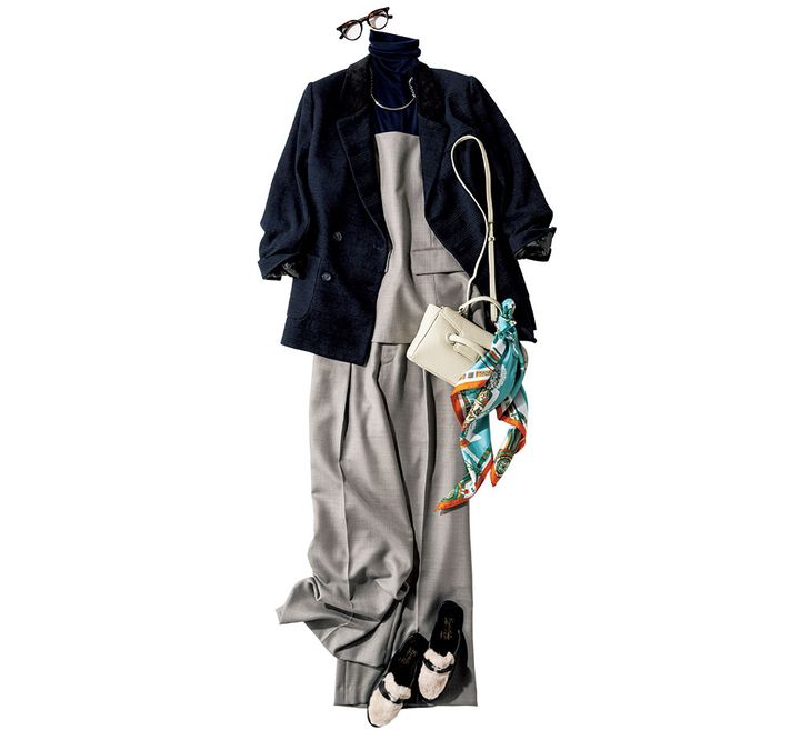 ジャケット¥30,800(カデュネ)ニット¥11,000(N.O.R.C)ビスチェ¥41,800パンツ¥41,800(ともにハイク/ボウルズ)バッグ¥50,600(ヴァジック/ヴァジックジャパン)スカーフ¥19,800(マニプリ)シューズ¥35,200(カステラーノ/フラッパーズ)メガネ¥42,900(アイヴァン/アイヴァン 東京ギャラリー)ネックレス¥71,500(ウノアエレシルバーコレション/ウノアエレ ジャパン)