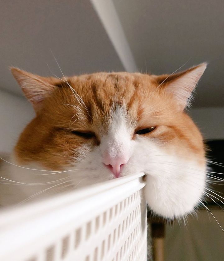 お顔をケースに乗せると、ほっぺだけがぷにぷにはみ出る様子がなんとも言えずかわいいですね。お餅になっている部分をつい触りたくなってしまいます。この投稿には「どんなときも手は抜かないニャ〜」「老舗和菓子屋の朝」「落ちちゃいそうだ」といったリプライがついていました。