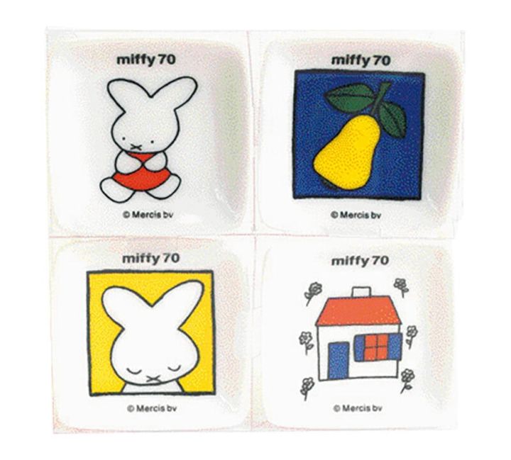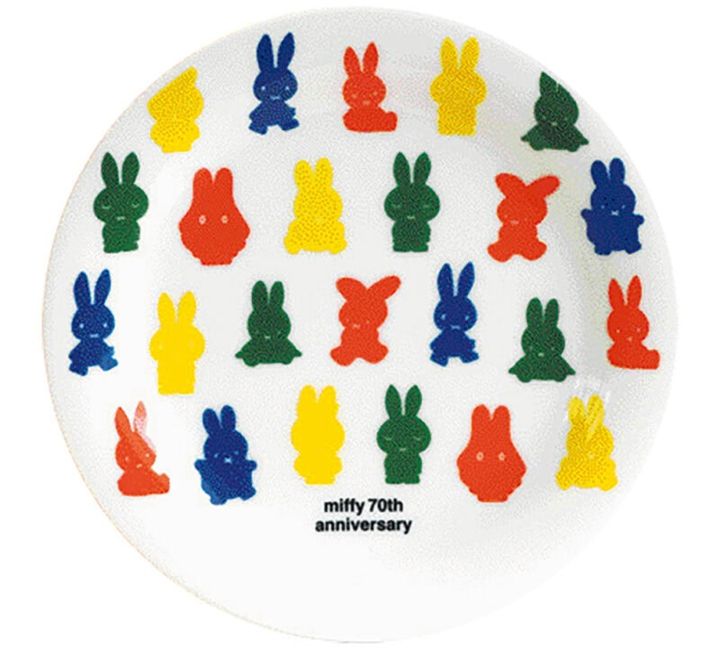 ミッフィーの初めての絵本「ナインチェ」のイラストを使用したデザインや、年代の違うさまざまなミッフィーが並んだ特別なデザインの食器アイテムが登場。