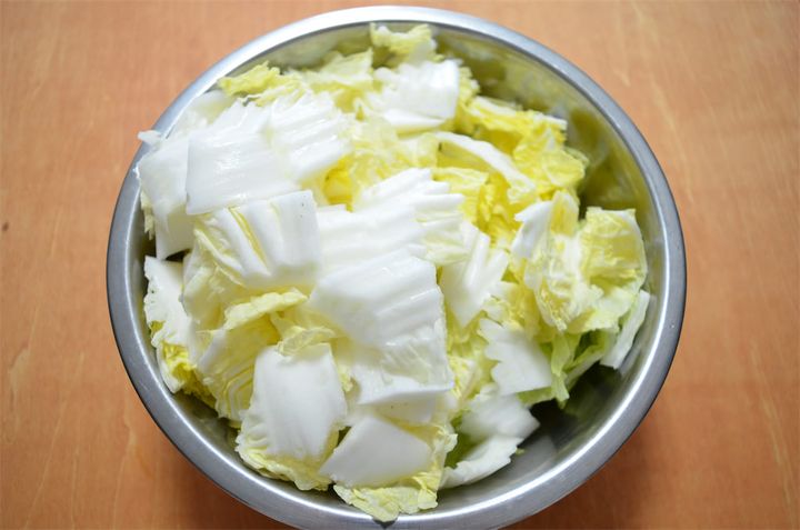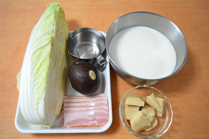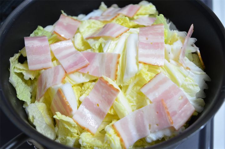 1.白菜とベーコンはひと口大に切り、水と一緒に鍋に入れ、フタをして中火で10分ほど煮る。