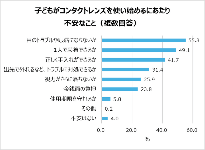 具体的にどんな不安を抱えているのかというと、「目のトラブルや眼病にならないか(55.3%)」、「1人で装着できるか(49.1%)」、「正しく手入れができるか(41.7%)」といった声が挙がっています。