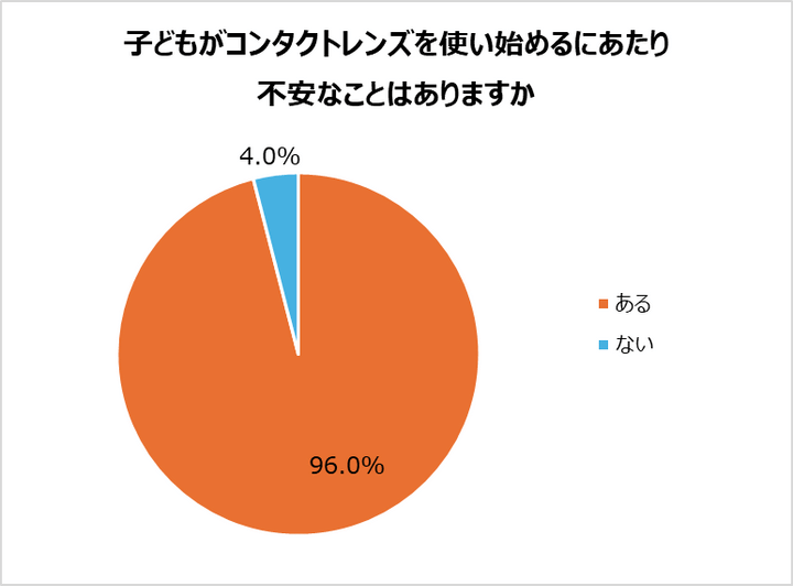 株式会社メニコンが、小学4年生以上中学3年生以下の子どもを持つ親1000名を対象に行った「子どものコンタクトレンズ選びに関する調査」によると、視力が低い、または低くなり始めている子ども(視力0.9以下)を持つ親の96%が、子どものコンタクトレンズデビューに不安を感じていることが分かりました。