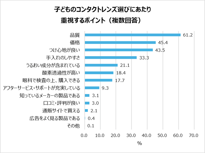 子どものコンタクトレンズ選びで重視するポイントの1位は「品質(61.2%)」、2位は「価格(45.4%)」という結果に。