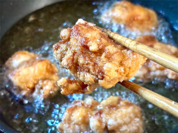 鶏肉がきつね色になったら180℃に温度を上げて、1~3分揚げます。濃いきつね色になり、鶏肉から出る気泡が少なくなるまでしっかりと揚げます。高温でカラッと仕上げることで、衣の水分を出し冷凍してもべちゃっとしにくくなります。