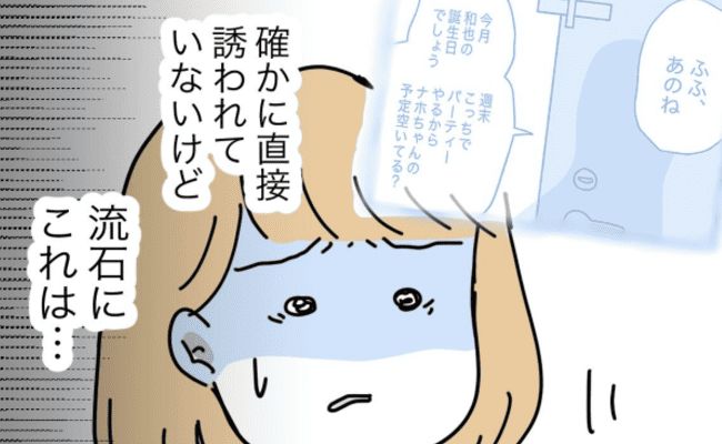 何も解決しないまま、義母宅で夫の誕生日パーティーが開かれる日に。部屋に入ると、机にお寿司が並べられていましたが、広子さんの分だけがありません。