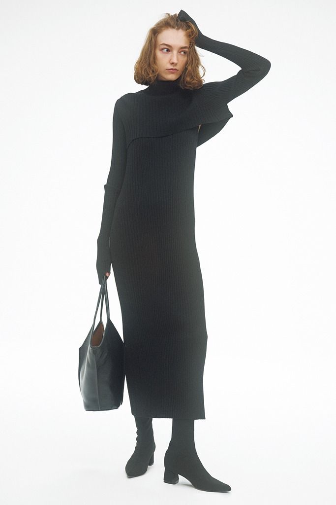 黒リブドレス/venit(ハルミ ショールーム) 黒バッグ/HEREU(ショールーム セッション) 黒ブーツ/TSURU By MARIKO OIKAWA