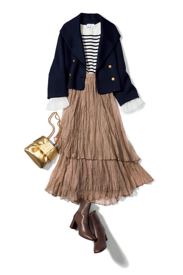 ボーダーニット¥16,400/アルページュ ストーリー ネイビーコート¥23,980/SNIDEL スカート¥20,900/マイストラーダ バッグ¥7,700/カカトウ(アンビリオン) 靴¥28,600/ダイアナ(ダイアナ銀座本店)