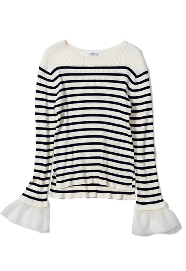 春の定番、ボーダーニットに、真っ白袖で甘さをひとさじ。カジュアル×レディのMIXバランスが新鮮! 細リブなら着痩せ効果も期待大。
