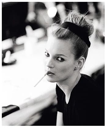 ケイト・モスは、カチューシャづかいもひと味違う。まとめた髪にざっくりとつけ、シャープな黒トップスの力みを抜くことで、モードな装いを気張らずにまとう「大人の余裕」を漂わせる。