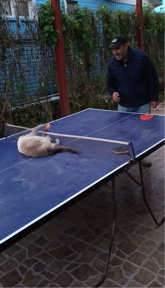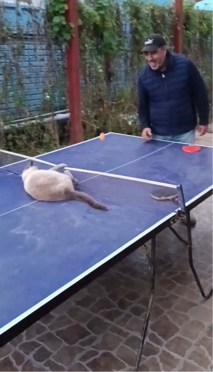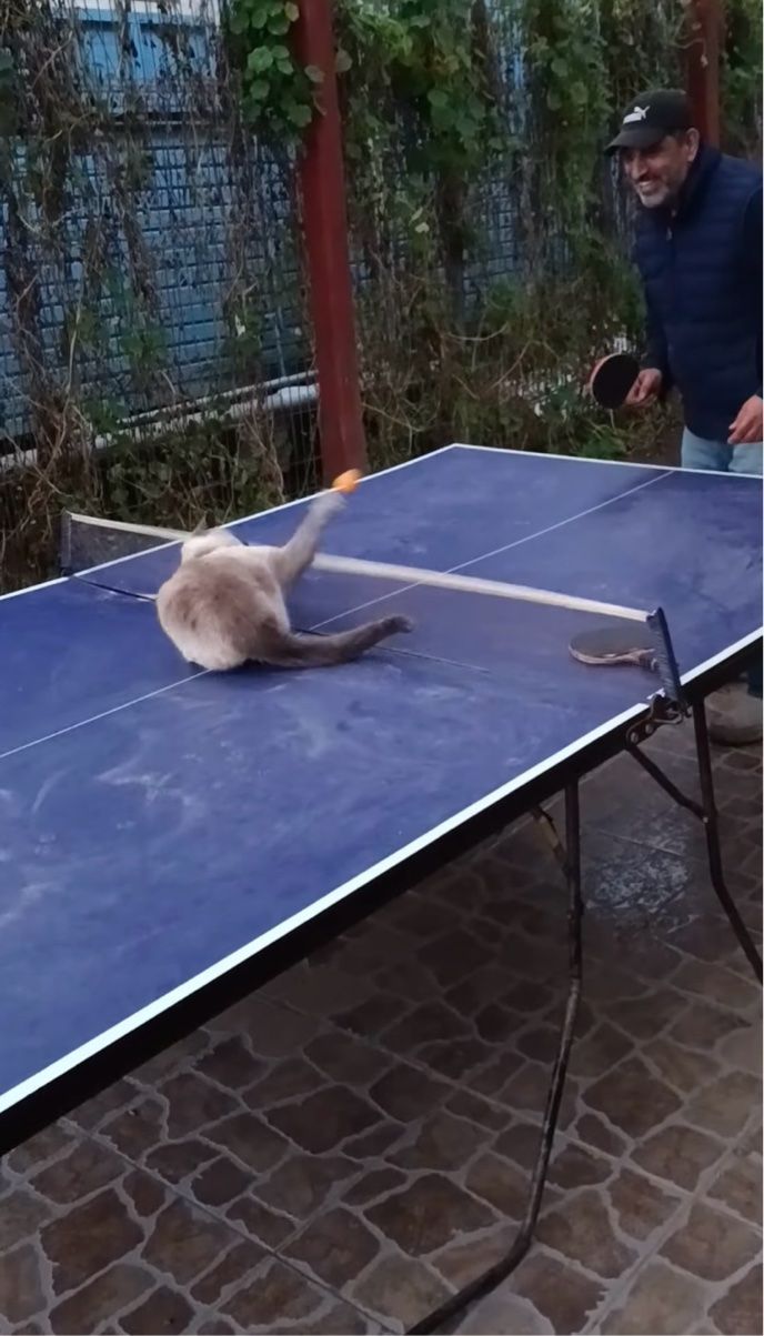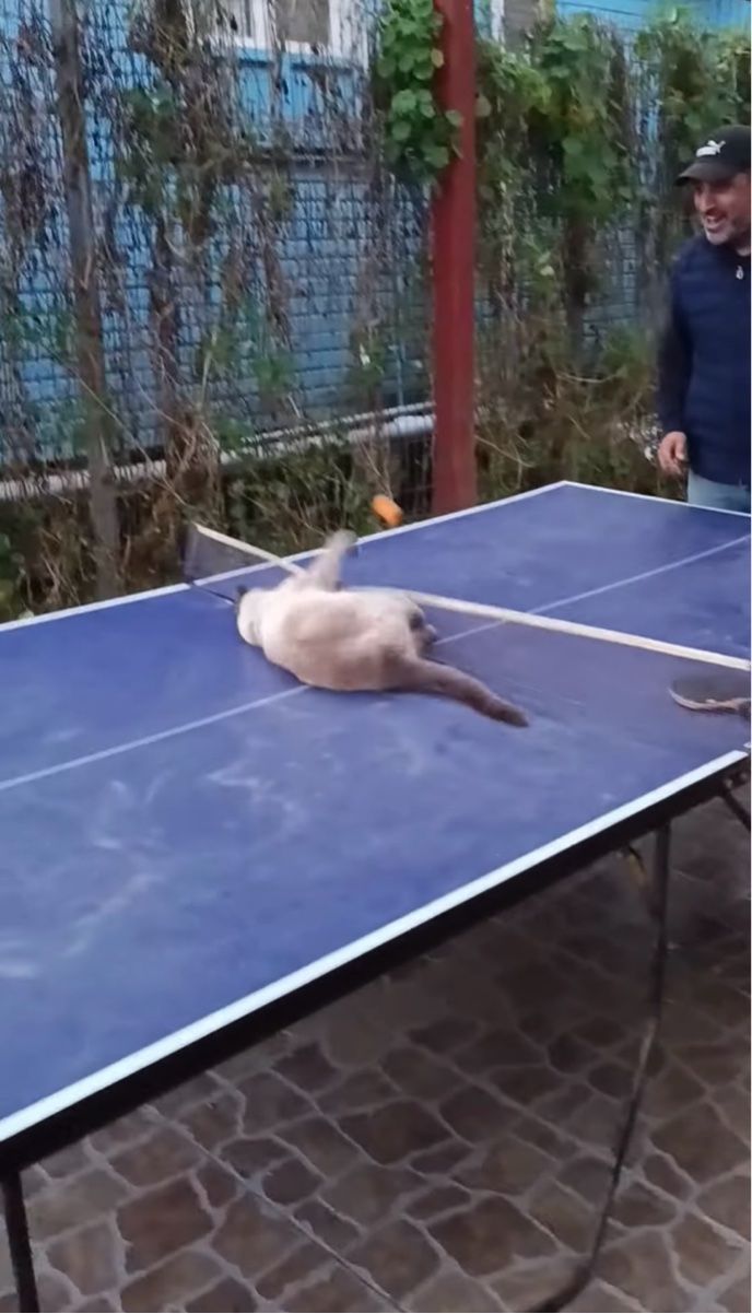 卓球台の上で寝転ぶネコに向かってピンポン球を放る男性。 このネコは、その球を鮮やかに打ち返してみせました!!