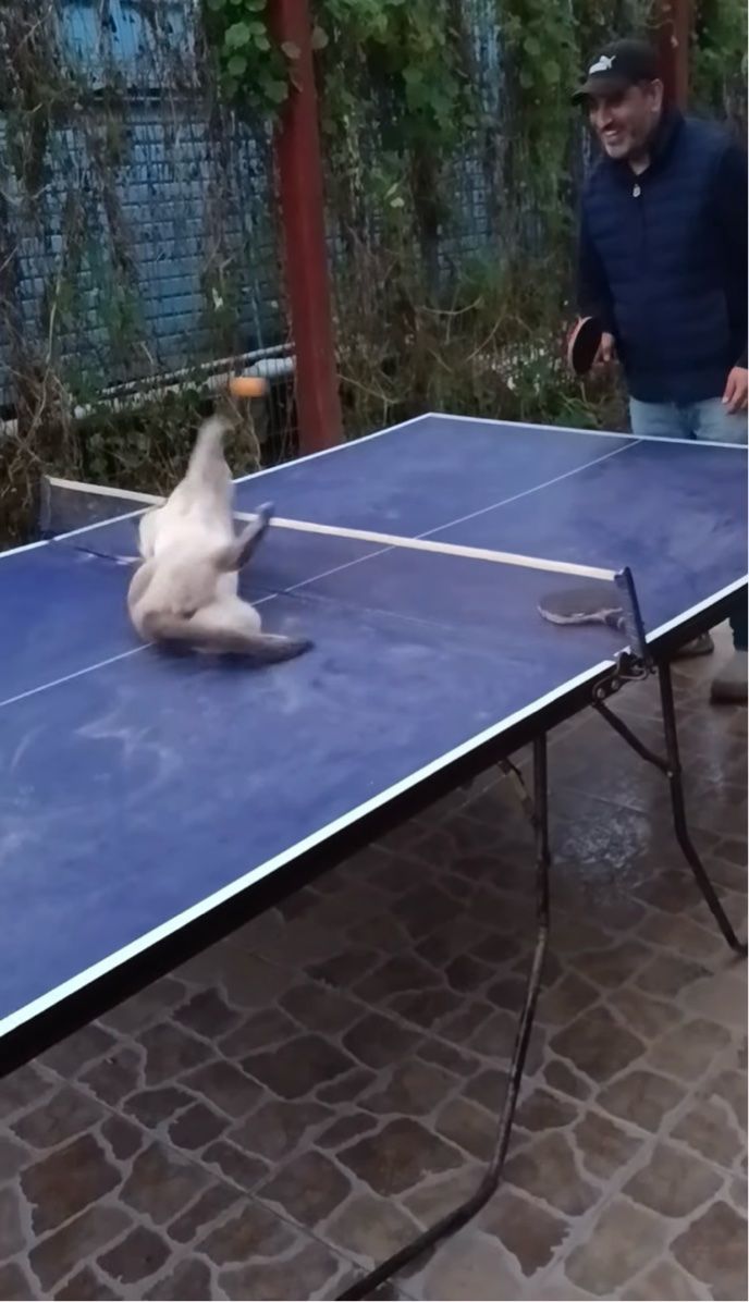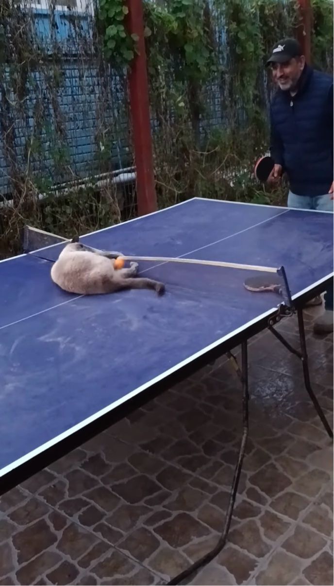 卓球台の上で寝転んでいるフィト。 くつろいでいるようにも見えるこの子に向かって、男性がピンポン球を緩やかに投げます。