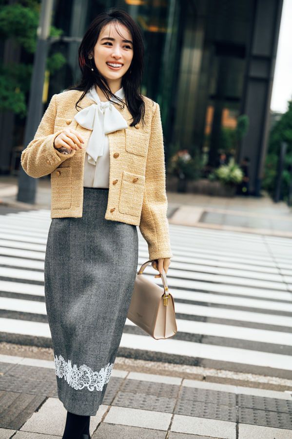 ジャケット¥26,400/ジャスグリッティー ブラウス¥6,930/MISCH MASCH(ダブルエー) スカート¥41,800/ルル・ウィルビー(アルアバイル) イヤリング¥17,600/ランバン オン ブルー(ヴァンドームヤマダ) バッグ¥72,600/ジャンニ キアリーニ(ジャンニ キアリーニ 銀座店) タイツ¥1,980/17°C(17°C by Blondoll 横浜ジョイナス店)