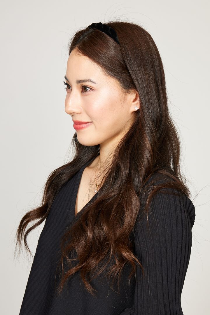 「不器用でヘアアレンジが苦手なので、子どもの習い事の発表会でも髪をゆるく巻いてカチューシャを付けるのみのアレンジでした。華美にならないよう、髪全体を巻いたあとにブラッシングをして巻き加減を調整しています。最近は髪の乾燥が気になるので、ケラスターゼのクロノジストシリーズのヘアオイルを必ず使いツヤを出すようにしています」デラクナー友理さん・32歳(166cm/10歳と6歳の女の子ママ)