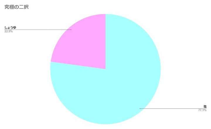 「一生同じ味付けしか食べられないとしたら?」というアンケートで、「塩」77.1%、「しょうゆ」22.9%という結果が出ました。こんな究極の選択、考えただけで悩んじゃいますよね!